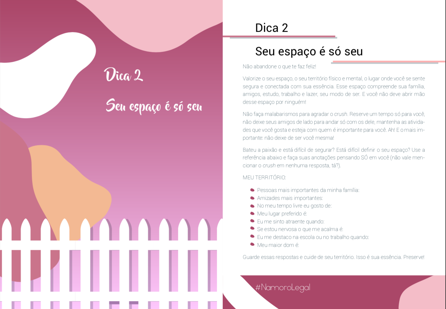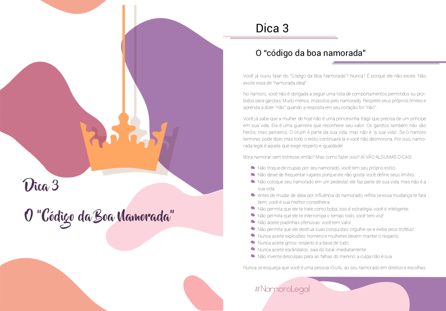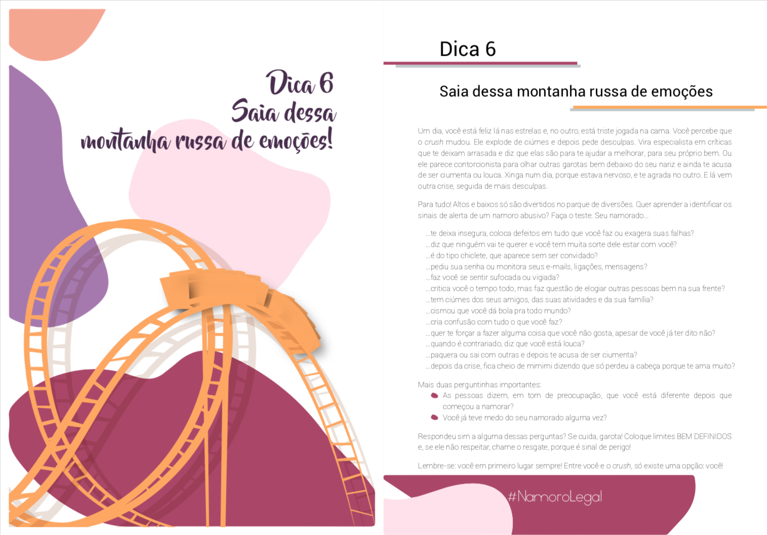 Relacionamentos fazem parte da vida, devem ser agradáveis e saudáveis, por isso, você pre- cisa saber impor limites. Para te ajudar, criamos a Cartilha Namoro Legal com dicas simples e práticas sobre relacionamentos. Nela, você vai descobrir como identificar comportamen- tos abusivos e o que fazer quando o namorado ou o crush é controlador.
