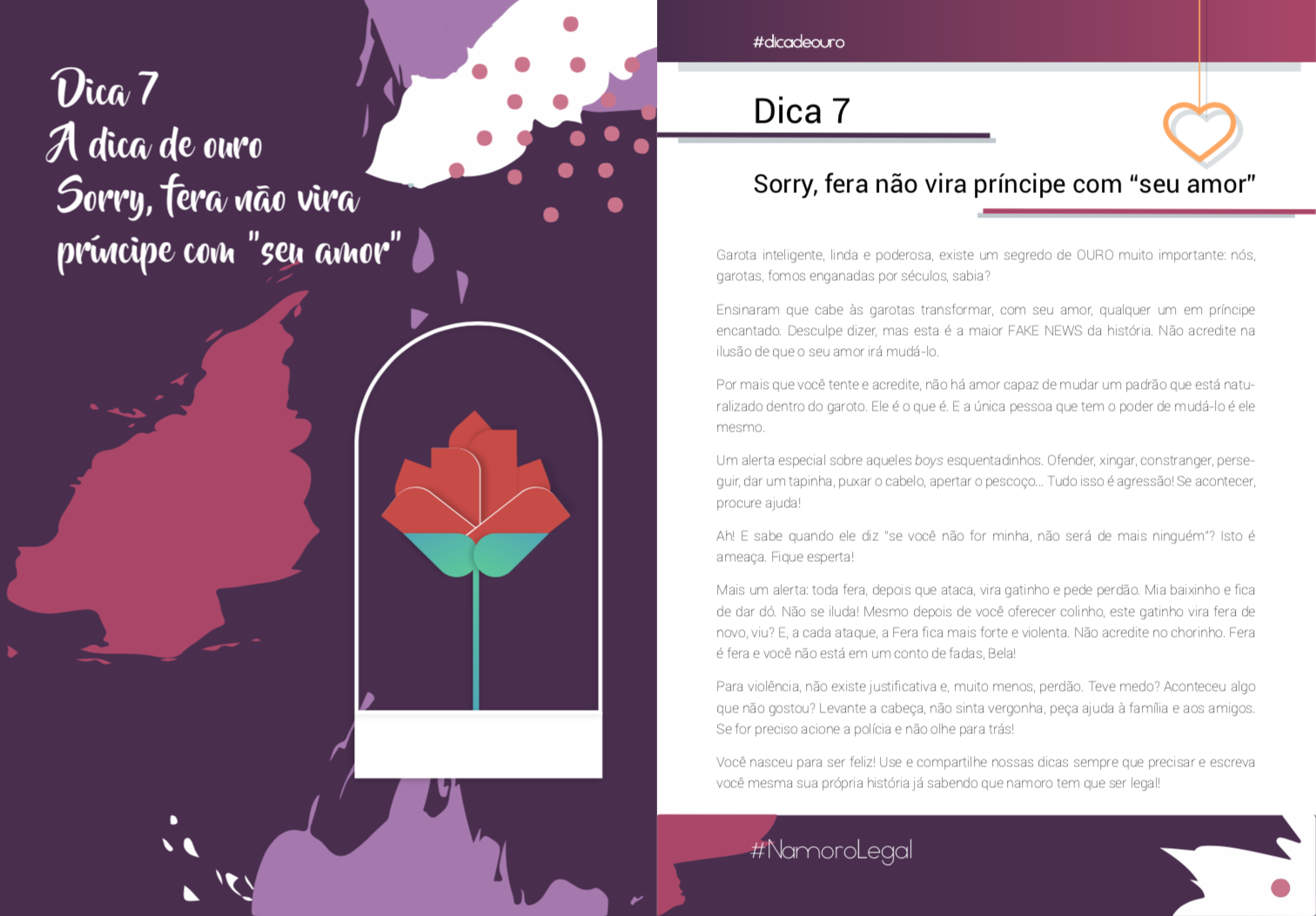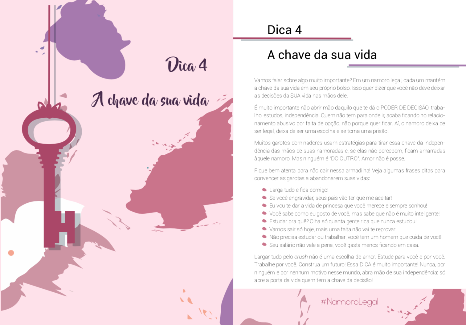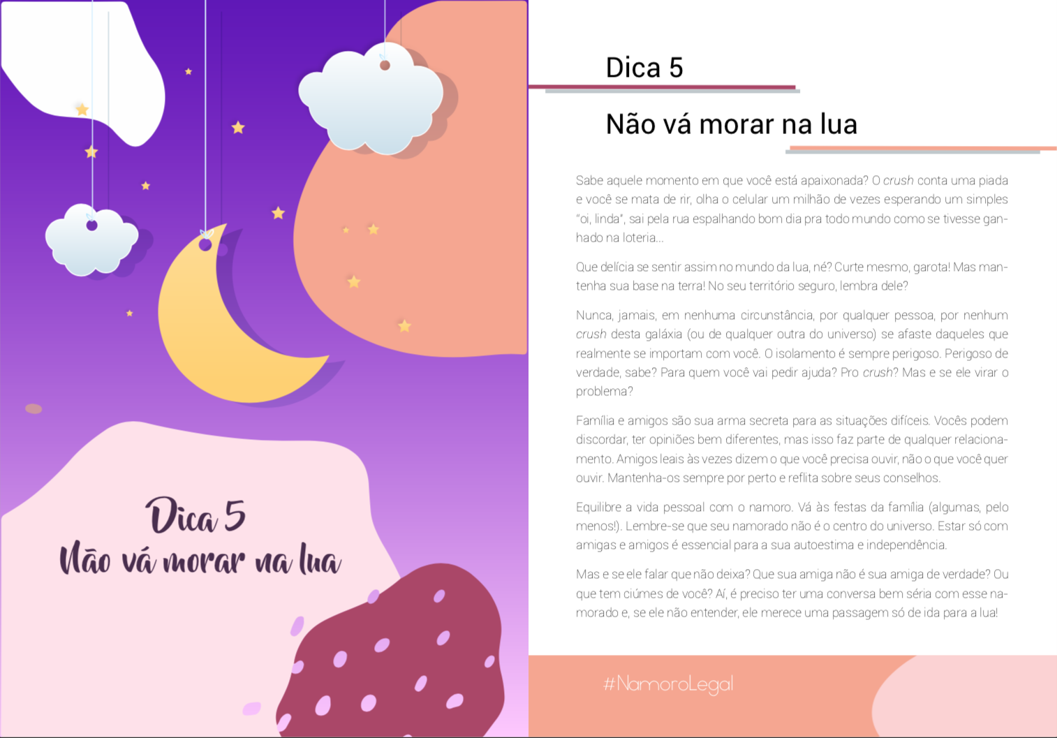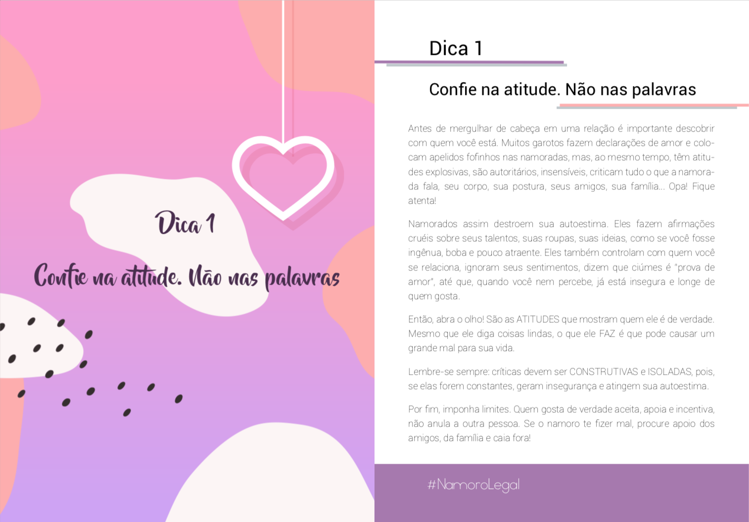 Relacionamentos fazem parte da vida, devem ser agradáveis e saudáveis, por isso, você pre- cisa saber impor limites. Para te ajudar, criamos a Cartilha Namoro Legal com dicas simples e práticas sobre relacionamentos. Nela, você vai descobrir como identificar comportamen- tos abusivos e o que fazer quando o namorado ou o crush é controlador.