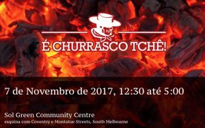 Churrasco Tchê – Terça 7 de Novembro 2017 (Melbourne Cup Day) – 1:00PM até 5:00PM – Sol Green Community Centre – Esquina Coventry e Montague Streets, South Melbourne.