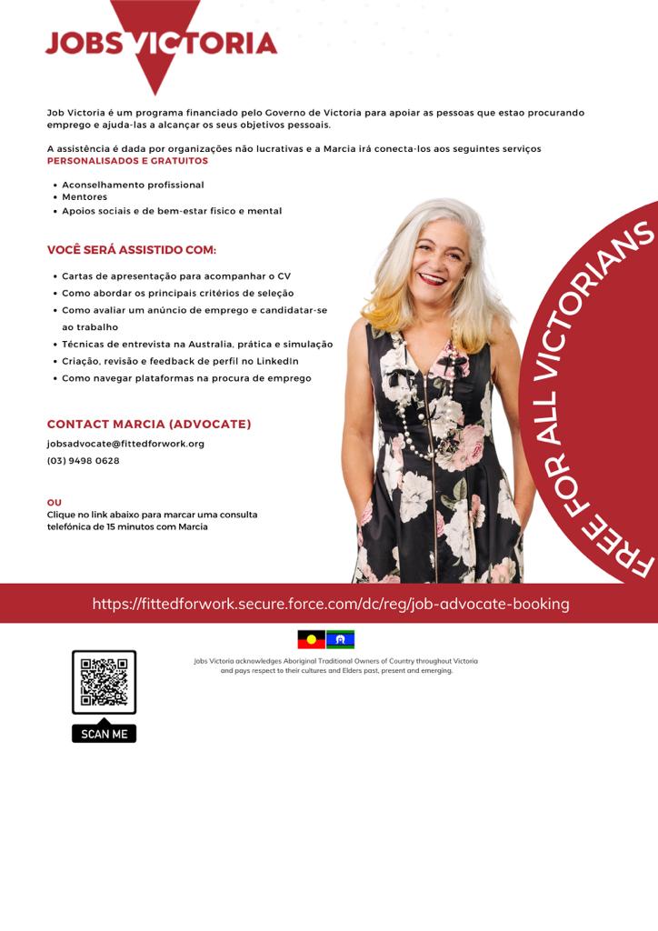 O ‘Jobs Victoria’ ajuda àqueles que estão procurando oportunidades de trabalho, especialmente os que vivem em habitações públicas, a encontrar formação local, experiência de trabalho e empregos. Jobs Victoria trabalha em parceria com a Irmandade de St Laurence e outras agências comunitárias locais para administrar cinco centros de trabalho e aprendizagem em Victoria. Quer saber a melhor parte? Tem uma brasileira trabalhando lá! A Márcia pode te ajudar a se preparar para encontrar a tão sonhada vaga de trabalho no mercado australiano. Para entrar em contato com ela basta enviar um e-mail ou bookar uma conversa no QR code da imagem.